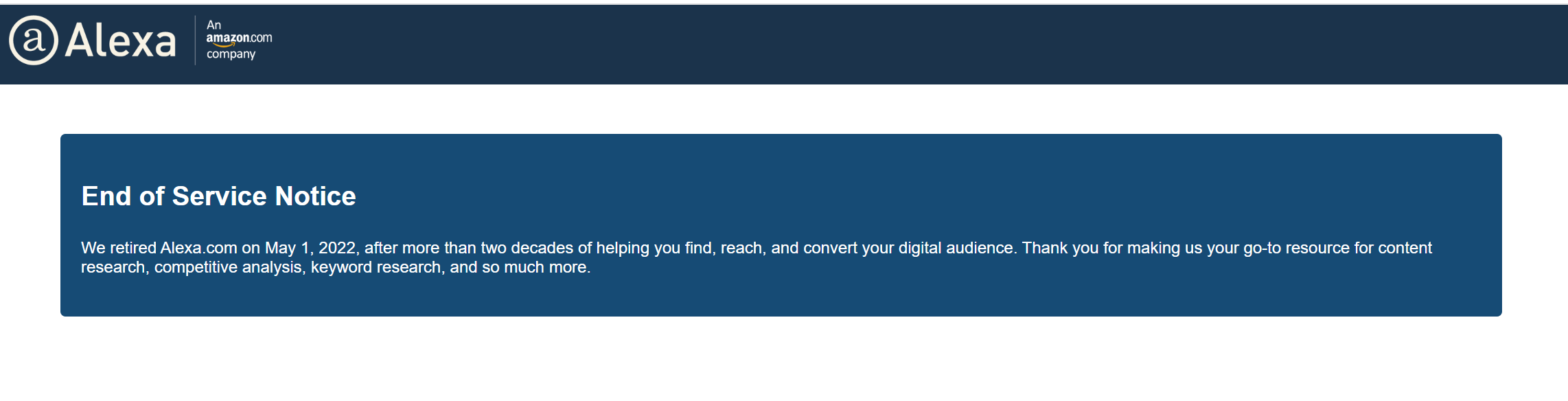 End of Service Notice We retired Alexa.com on May 1, 2022, after more than two decades of helping you find, reach, and convert your digital audience. Thank you for making us your go-to resource for content research, competitive analysis, keyword research,